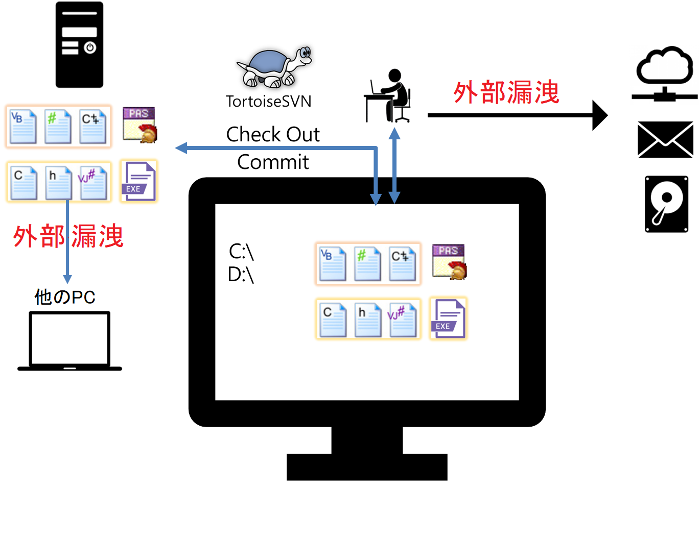 イメージ図の通り、全く制限を受けない端末でソースコードを書くと、ユーザはクラウドHDD、メール、外部記憶デバイスなどでソースコードをコピーし、持ち出せます。