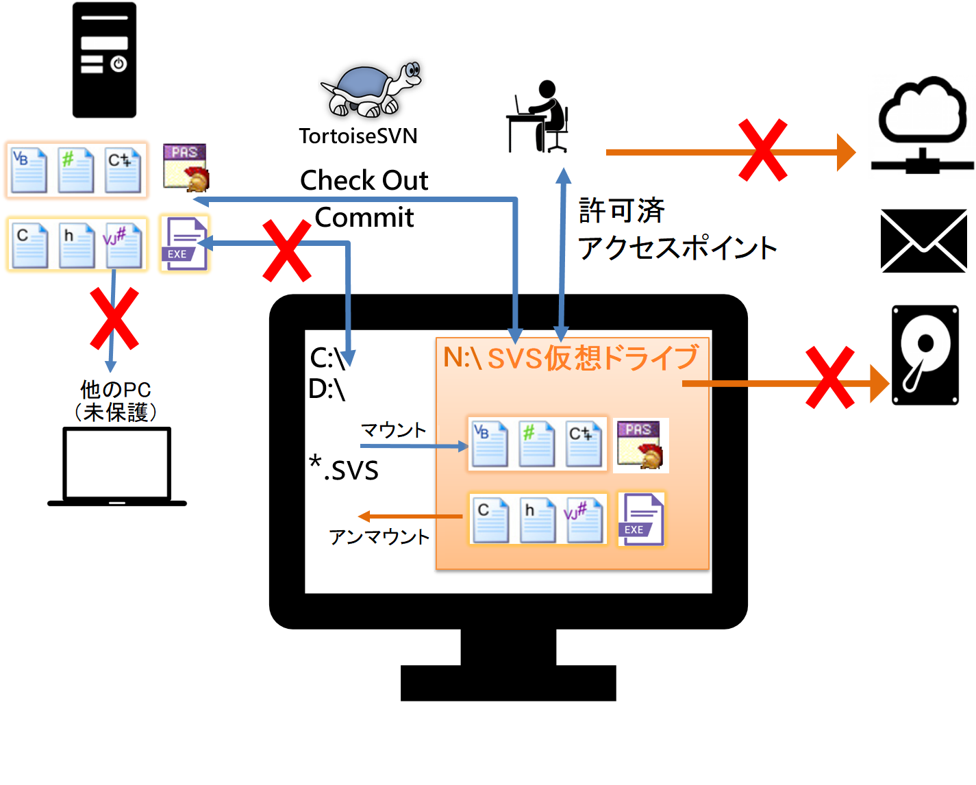 SVTで、SVNなどのバージョン管理サーバにSVT経由でしか接続できないように制限して、SVT経由で入出力したファイルはSVSディスク内にしか保存できないようにすることで、開発のバージョン管理・情報検索・ライブラリダウンロードなどの作業に極力影響を与えずに、ソースコードの漏洩を防止します。