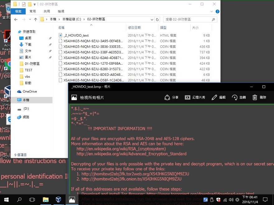これが一番よく見るケースで、ユーザはPCを通常通りに使用でき、ネットにも接続できます。(PCを操作してネット上で復号費用を支払うのに使えます)ランサムウェアはよく使われるOfficeファイル、PDFファイル、画像ファイル、VDI、DWG…等などを暗号化して、フォルダに暗号化された旨と支払いの手順についてのメッセージを残します。右図は弊社がサンドボックス環境でテストしてキャプチャした実際の画像です。デスクトップの壁紙がランサムウェアにより置き換えられ、フォルダも暗号化され、リネームされています。(一部のランサムウェアはファイル名をリネームしません)ファイルが暗号化されたあと、脅迫メッセージの画像ファイルが開きます。