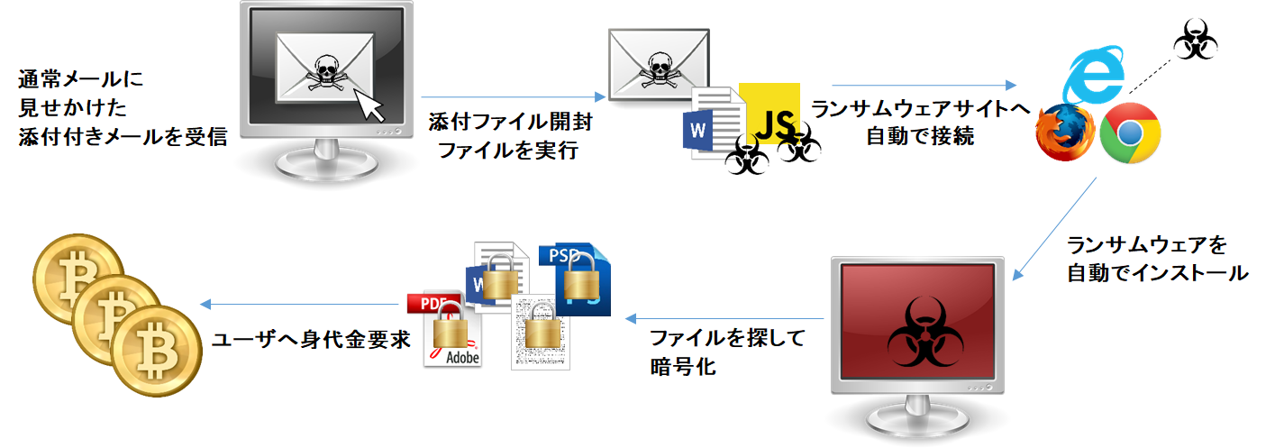 一度端末にランサムウェアがインストールされてしまうと、通常は以下の動作が実施されます。