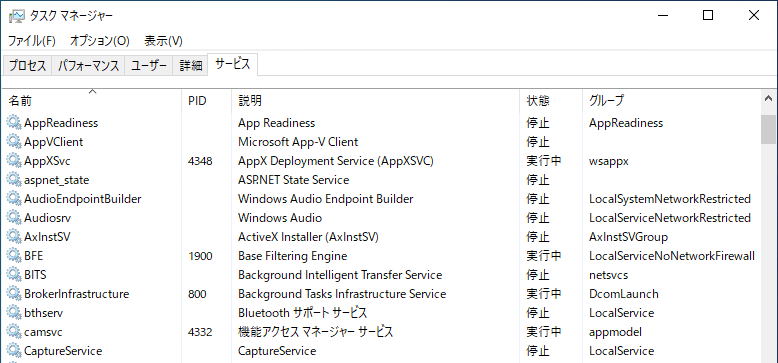 タスクマネージャーを呼び出して上部の「サービス」タブをクリックすると、どのサービスプログラムが実行されているか確認できます。
