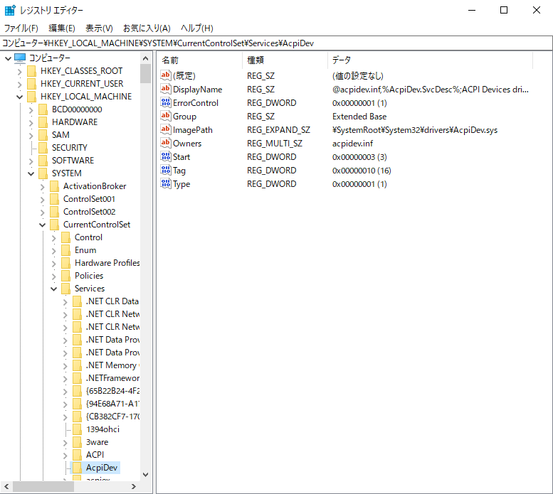 下図の例では、AcpiDevのキーの値は「3」で、手動読み込みに設定されています。(現在は起動していません)興味を持った方は前述のサービスツールの表示値と比較してみてください。