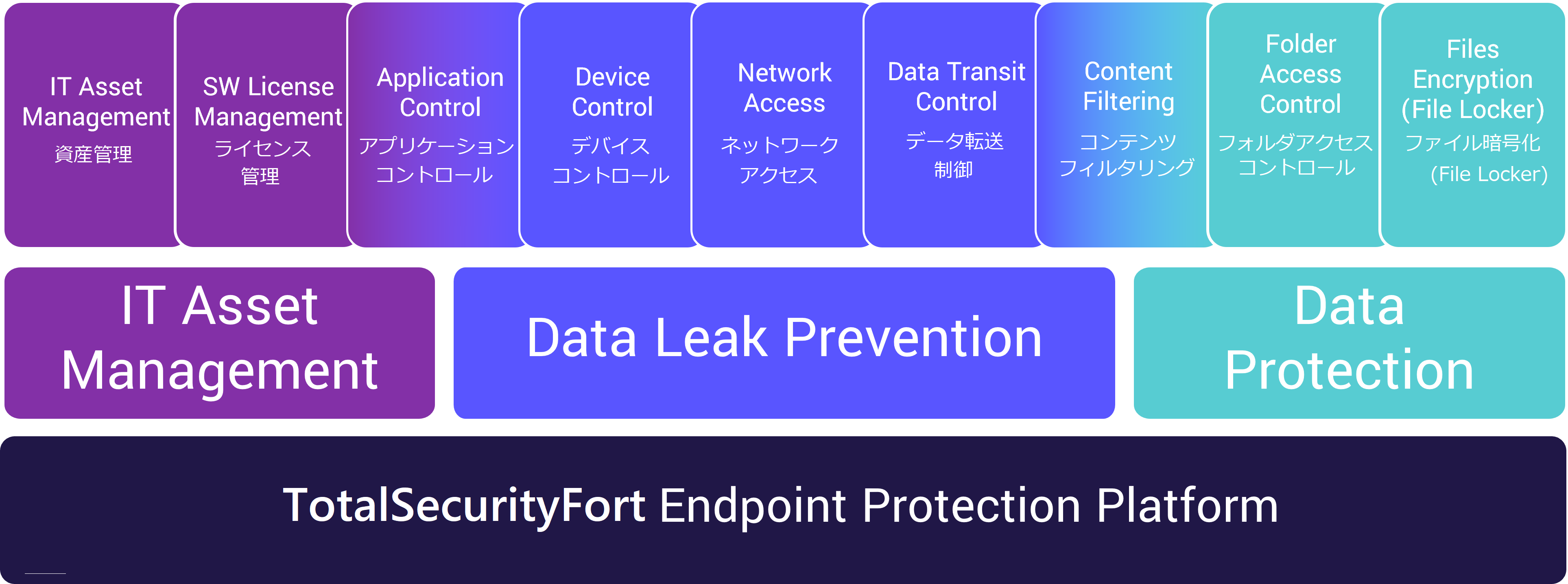 TSFはDLP:Data Leak Prevention(情報漏洩防止)、ITAM:IT Asset Management(IT資産管理)、Data Protection(データ保護)、EDR(エンドポイント検知対応)機能を含む製品で、各種サービスを幅広く提供していますが、ここではDLP(情報漏洩防止)に焦点を当てて説明します。