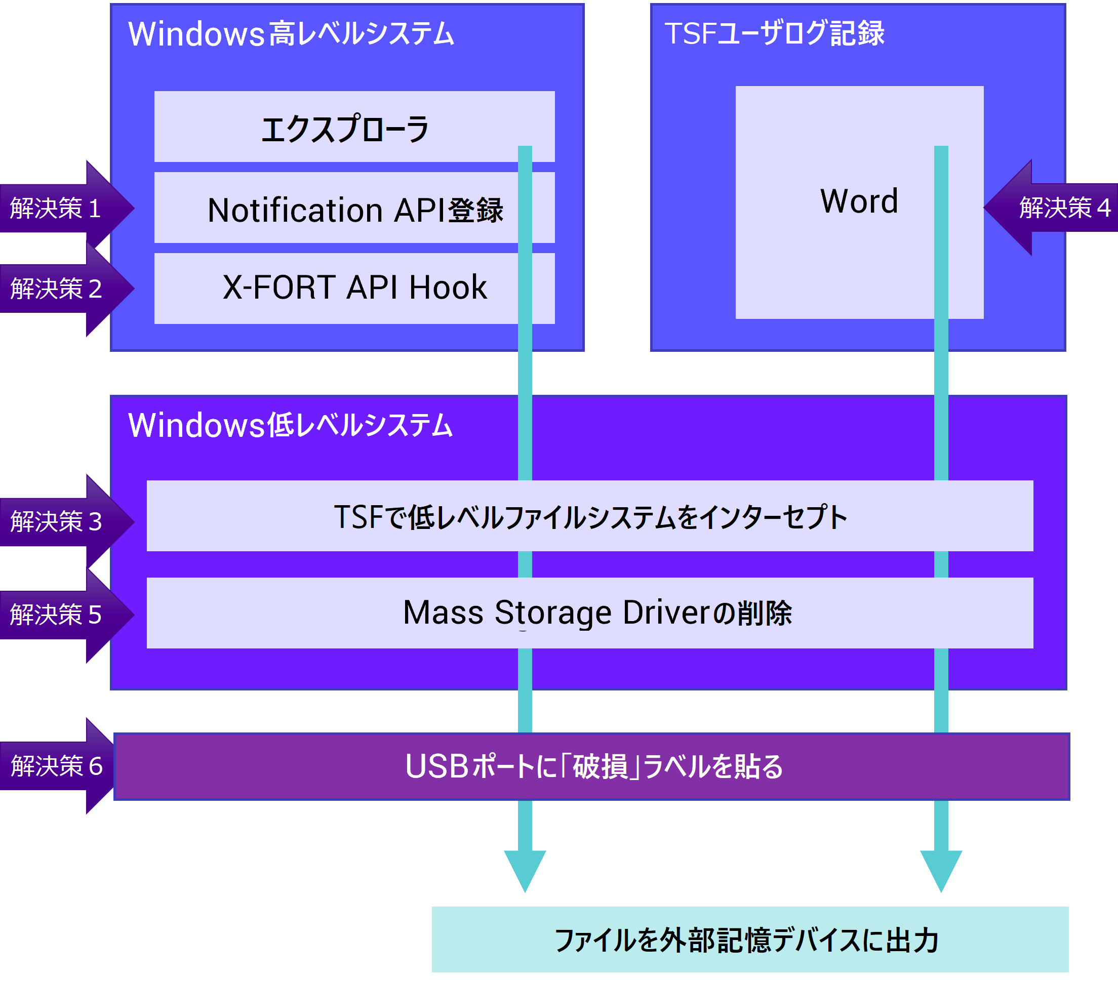 上記は、基本的な制御ポイントに対する基本的なアプローチを示したものであり、実際のユーザアプリケーションではさらに複雑なものになります。例えば、ユーザが外部メディアにファイルを書き込みたい場合、管理者承認を要求したりファイルの強制暗号化を要求したりするかもしれません。詳細なソリューションについては、TSFカタログを参照いただくか技術スタッフにご相談ください。
