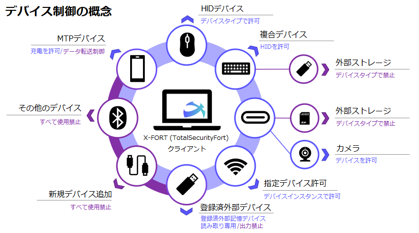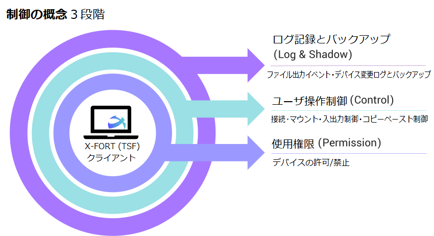 PCから外部デバイスにデータを持ち出すには、ドライバ・アプリケーション・ファイルシステムなどが協力する必要があります。異なる場所に制御を掛けても、同じようにブロックができます。データを持ち出すためのルートはたくさんあり、各種ルートをひと通り制御することで不測の事態を回避することができます。