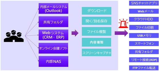 従業員は日常業務で、各種システムからファイルをダウンロード・コピー・別名保存などでファイルを取得できます。また、コピー/ペースト・スクリーンショットで画面を取得する方法も使えます。これらはすべて業務に必要かつ企業が許可している作業方法です。