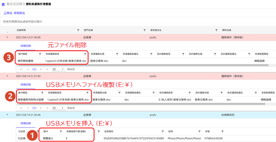 TSFは、まずUSBにファイルを書き込む際に警告を出し、その後管理者は複合ログからユーザの行動軌跡を確認できます。
