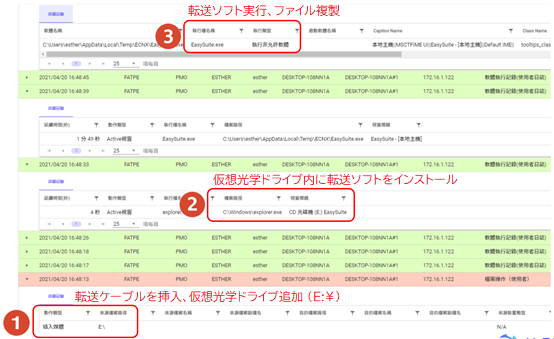 この転送ケーブルは、USB延長ケーブルのような見た目で、本体には保存機能がなく、机の上に置いても怪しまれません。しかし、PCに接続すると仮想光ディスクドライブが生成され、そのドライブにはインストール不要の双方向転送ソフトウェアが入っています。2台のPCを接続するだけで、転送ソフトウェアを介して会社の研究開発ファイルをを持ち運び用の小型PC(MINI PC)に転送できる非常に察知されにくいデータ転送手段です。しかし、TSFの複合ログにより、当事者のPCに仮想光ディスクドライブが追加され、その後に光ディスクドライブ内の実行ファイル(EasySuite.exe)が実行されたことがわかります。これは転送ソフトウェアという許可されていないソフトウェアのため、実行ログが生成されました。