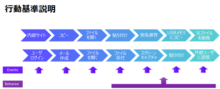 情報セキュリティシステムにおいて、すべてのイベントは個別に触発され、システムで発生したことは詳細にログとして記録されますが、このログだけでは意味のあるユーザ行動として説明できませんが、前後の文脈を含めて初めて行動の意味が示されます。行動基準として、添付ファイル・スクリーンショット・外部受信者などの関連イベントと組み合わせて明確なユーザ行動として確認できます。
