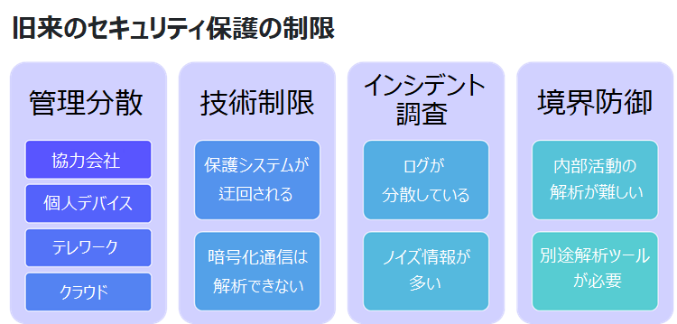 ほとんどのネットワークセキュリティ専門家は、ネットワーク攻撃に対処する際のセキュリティ侵害指標(Indicator of Compromise:IoC)関連の訓練を受けているでしょう。しかし、この方法は事後的な検証に分類され、ユーザの行動検出に関してはあまり効果的ではありません。さらに、在宅勤務に移行した場合は従来の明確な保護境界が消失するので、セキュリティ保護はより困難になります。過去にはエンドポイントセキュリティ・SIEM・EDR・IDP・UTM・ファイアウォールなど、外部侵入および攻撃に対する情報セキュリティ防御システムが設計されは成功してきました。しかし、内部の脅威活動を発見するためにこれらを導入する場合、多くの制約条件が発生します。