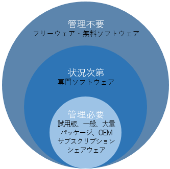 以下は管理のメインをソフトウェアのタイプ「試用版(Trial)/大量ライセンス(Volume)/一般ライセンス/バンドル (Embedded)/サブスクリプション(Subscription)等」に分けて、資産管理ツールをどのように活用すべきかを説明します。